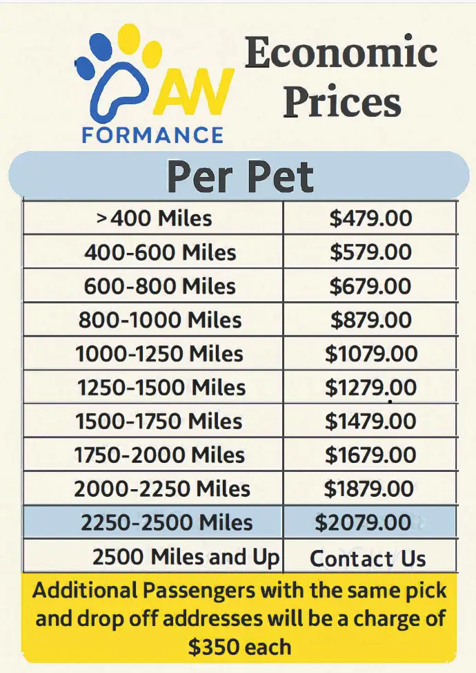 Pricing depends on distance, number of pets, and travel logistics. Below are our 3 trip options to fit your needs best.